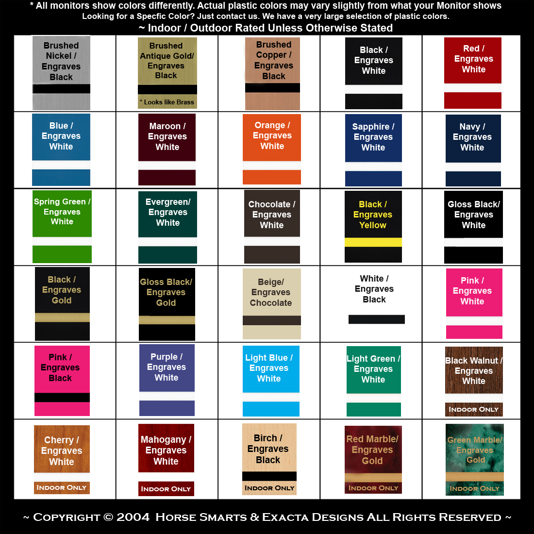 Plastic tack trunk plate with your choice of personalized text. Our plastic tack trunk nameplates come in many color combination. If you do not see the color combo you are looking for just send us an email and we might be able to find what you need. These plastic tack trunk plates also work great for office door signs, feed room signs, no soliciting signs, arena signs, barn rules, hours of operation and more. Indoor / Outdoor Use
